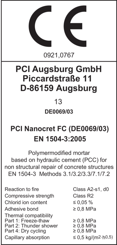 - Finspackel för användning efter betongreparation med PCI Peciment 50 på lodräta råbetongytor utan gångtrafik inom byggnads- och brokonstruktion, i enlighet med tyska ZTV-ING för användningen PCC II: Otrafikerade områden med dynamisk belastning (t.ex. undersidor på broar).